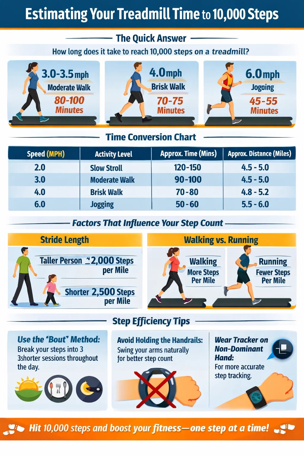 Es ist wichtig zu verstehen, dass a Laufband Verfolgt Distanz und Geschwindigkeit, die für 10.000 Schritte erforderliche Zeit variiert jedoch je nach individueller Biomechanik. Da sich das Band mit einer konstanten Geschwindigkeit bewegt, muss Ihr Körper seine Trittfrequenz anpassen, um mithalten zu können.