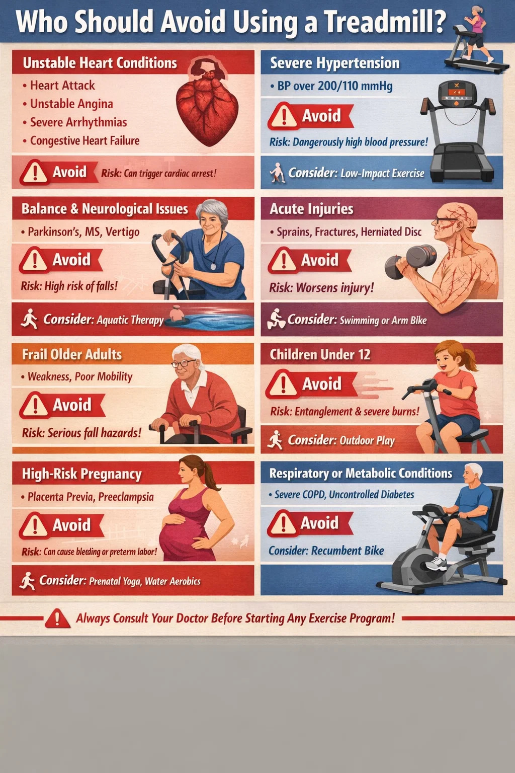 In diesem Artikel werden die einzelnen Hochrisikogruppen im Detail aufgeschlüsselt und die damit verbundenen spezifischen Gefahren erläutert Laufband Übung für jeden und bietet gegebenenfalls alternative Bewegungsmöglichkeiten an.