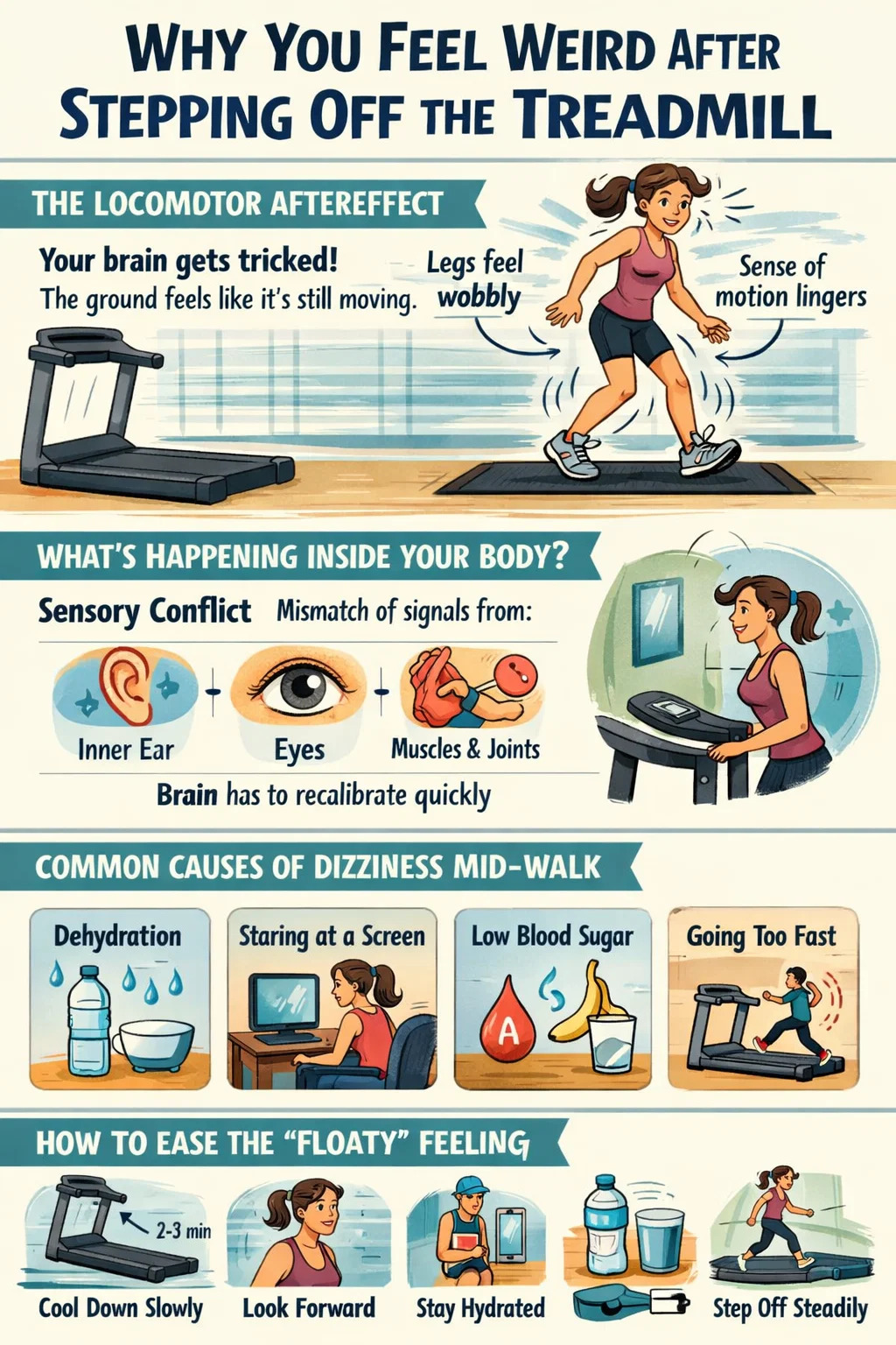 Dieses seltsame, schwebende oder unsichere Gefühl, das man nach dem Aussteigen verspürt Laufband hat einen Namen – es heißt Laufband-induzierte Bewegungsnachwirkung , und es ist völlig normal. Wenn Sie auf einem Laufband laufen, gewöhnt sich Ihr Gehirn an das Gefühl eines sich bewegenden Bandes unter Ihren Füßen. Sobald Sie absteigen, erwarten Ihre Beine und Ihr Gleichgewichtssystem weiterhin diese Bewegung, aber der Boden bewegt sich nicht. Das Ergebnis? Sie haben das Gefühl, dass sich der Boden verschiebt, Ihre Beine fühlen sich schwer oder federnd an und Ihr ganzer Körper scheint ein wenig unruhig zu sein.